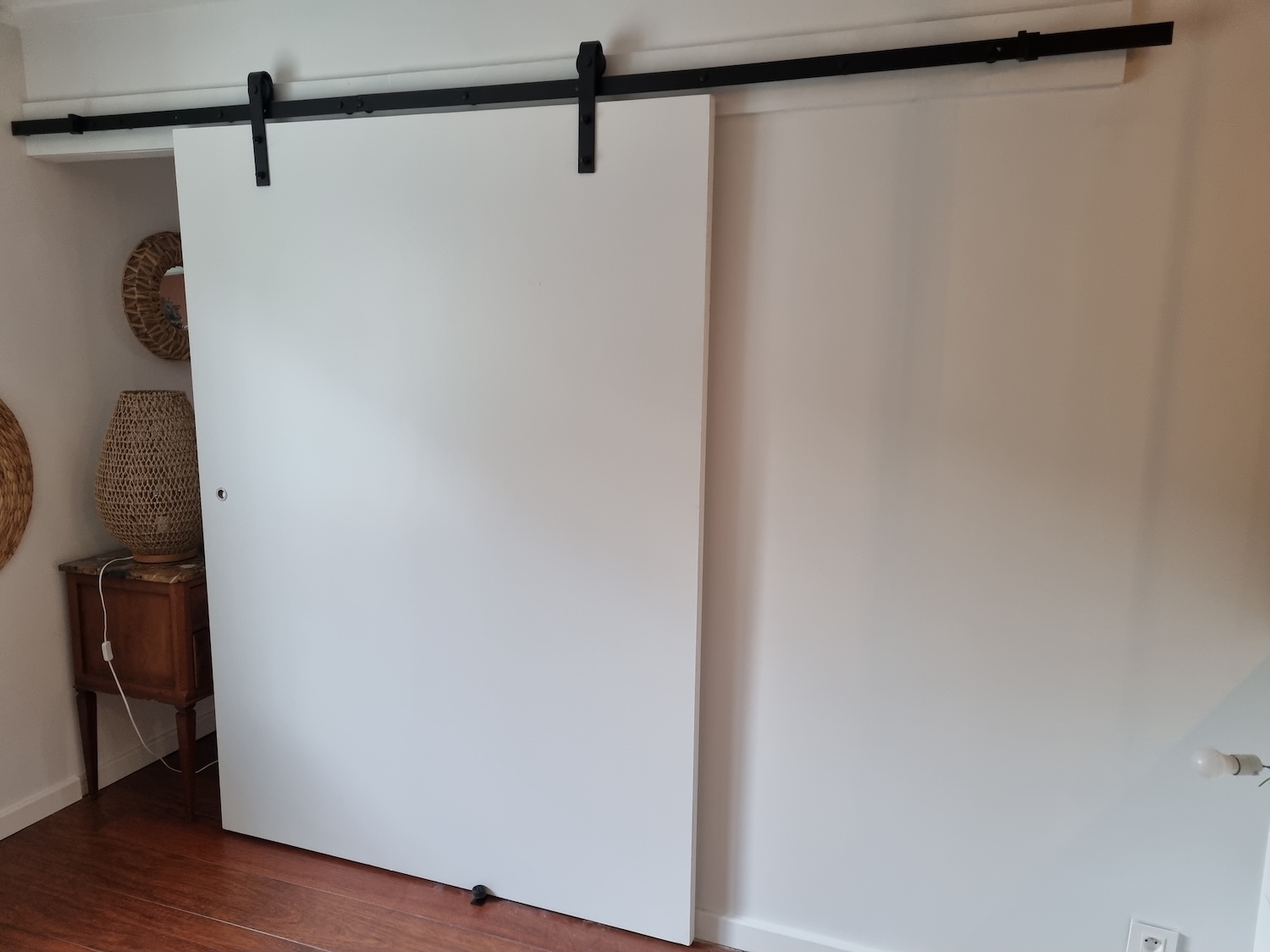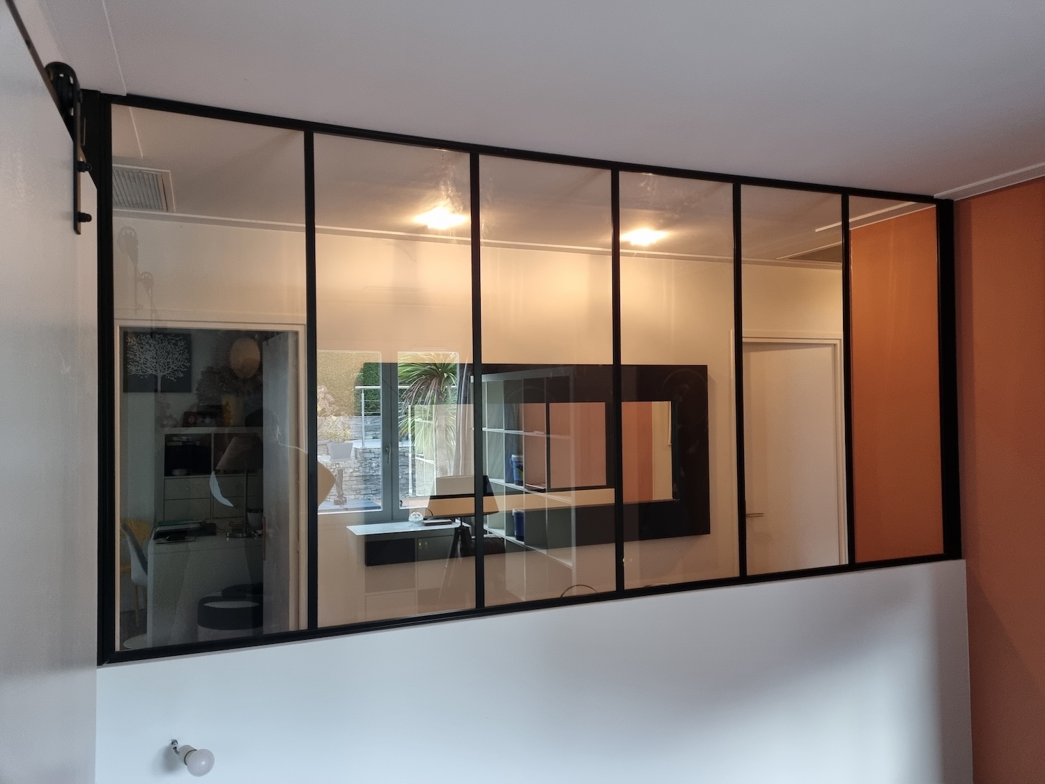 Réalisation complète d’un muret en plaques de plâtre (placo) servant de séparation intérieure, suivi de la pose d’une verrière type atelier de 3 mètres de long sur 1,44 m de haut.